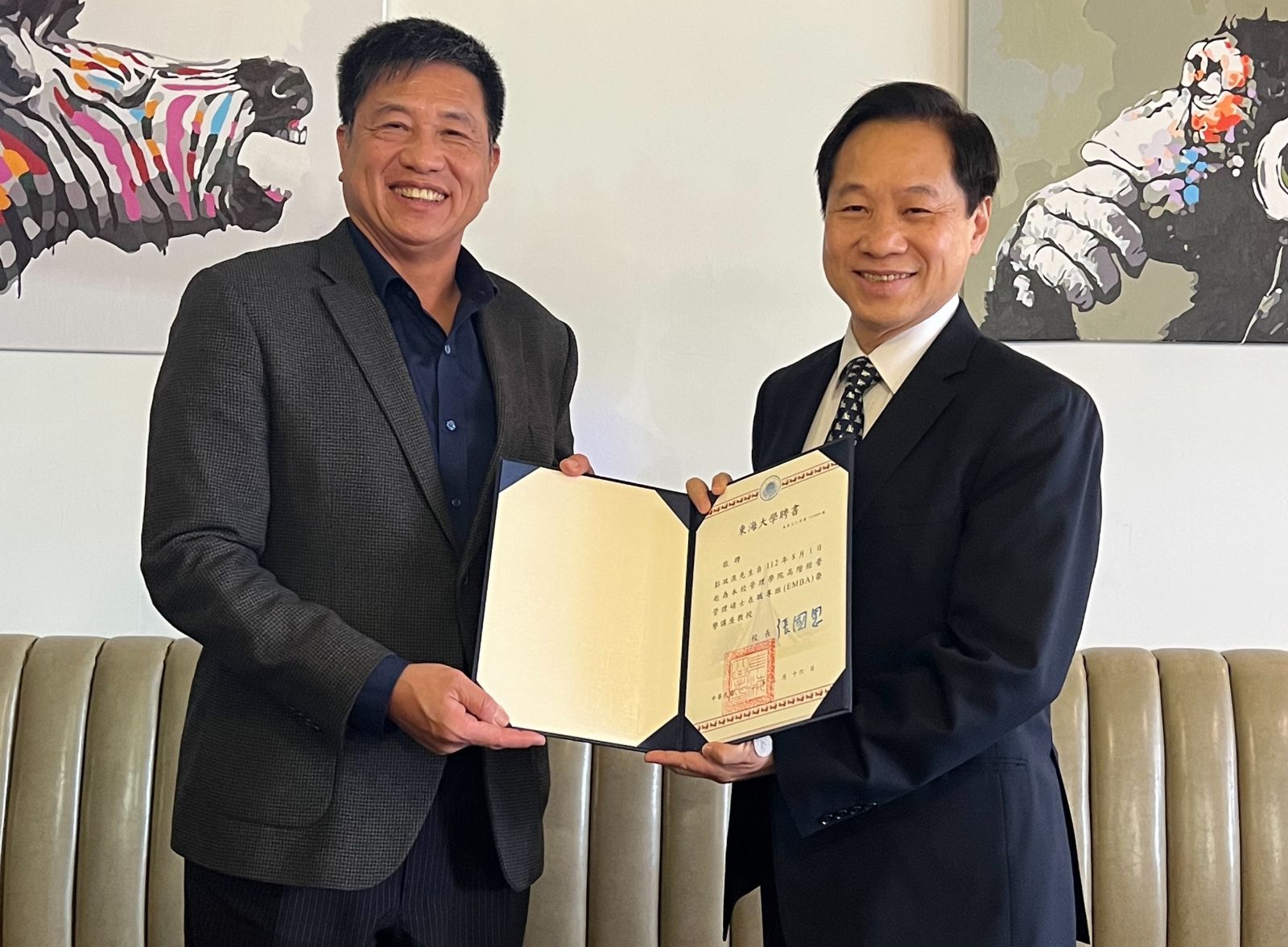 東海大学学長張國恩(左画像右および右画像左)が講義教授の資格授与式を行いました。