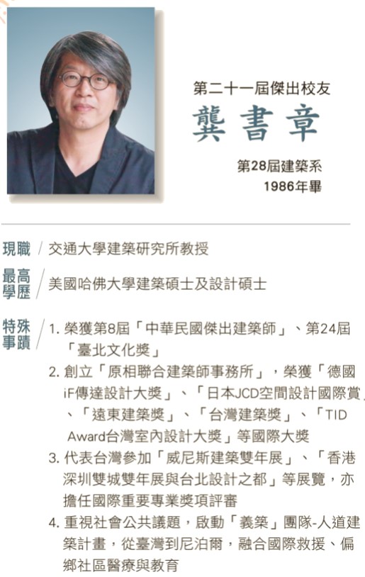 外人眼中意料之外的發展,對於龔校友來說,其實是早有謀定的計畫。他認為「所謂建築,就是一個不斷破格、不斷打破各樣窠臼與傳統的過程。」因此他也相信建築能夠改變與影響社會,若能成為教師、成為理論和行動的傳遞者,也更能呼應和發揚過去他在東海建築中所學到,師長們想要傳承的風範,讓建築人不只是建築的創作者,還能夠創造一個有益於人的生活環境。