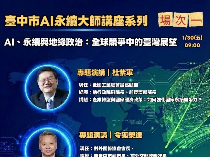 面對美中關稅與地緣政治變局 臺中AI永續大師講座登場 杜紫 ... 2026/01/20 點閱:132 面對美中關稅角力、地緣政治升溫與AI技術重塑全球供應鏈,臺中作為臺灣關鍵製造與精密機械重鎮,正站在產業轉型與永續競爭力的關鍵門口。臺中市政府經濟發展局攜手...