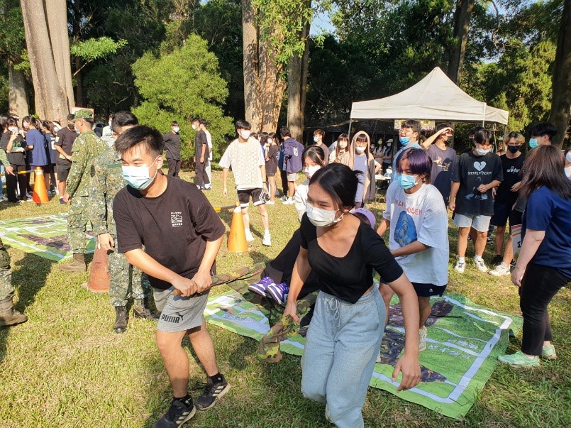 「強健體魄-戰鬥體適能計時賽」項目,由陸軍第十軍團主課,模擬一旦戰爭爆發,戰場資源不足的情況下,如何利用迷彩服及兩支棍子組裝成臨時擔架,協力戰場傷患搬運。這個項目非常考驗班級團隊默契,看著搬運兵七手八腳的組裝擔架,在隊長、警戒兵及彈藥兵的護送下,將傷患安全搬運到指定位置,三組人員接力完成,最後復原裝備位置,即可完成計時賽,各時段取優勝班級頒發獎品,同學們反應相當熱烈。
