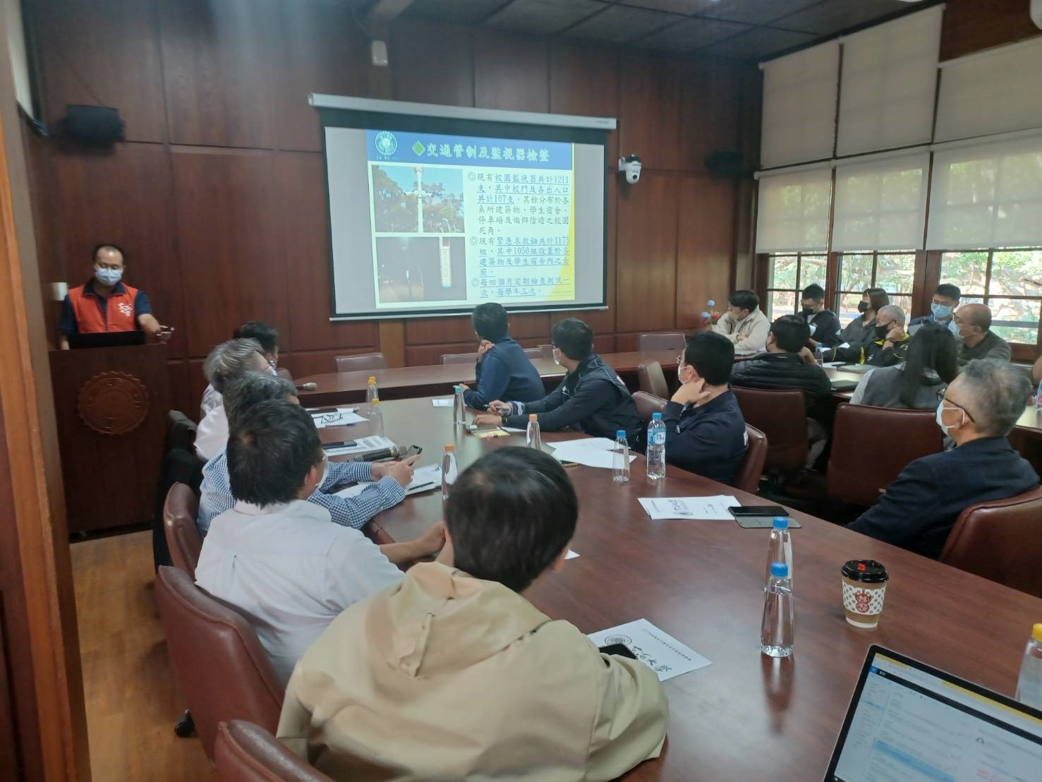 會議首先由校安中心上校教官楊正雄針對「校園安全暨災害防救執行成效」實施20分鐘簡報,置重點在「校園安全自主檢核表」及「校園防災計畫」各項實施成效說明。最後在人為災害部分,特別著重於防火訓練與交通安全事故具體防範作為,尤其在111年度以交通安全事件發生最多,校內學務處、總務處、環安衛中心等,針對年度各項校園安全暨防災作為提出具體改善措施。意見交流部分由學生會會長,係針對校園滅火器及監視器檢整提出建議,協和派出所副所長也提出會定期檢整校園周邊治安死角相關燈具及監視器。