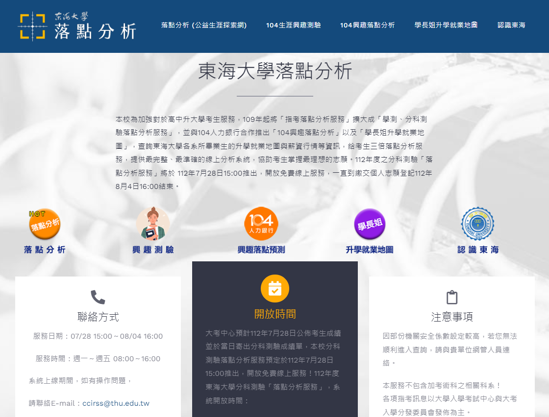 東海大學112年度大學入學「分科測驗落點分析」服務,將於 112年7月28日15:00推出,開放免費線上服務,一直到8月4日16:00登記個人入學志願結束。網址為https://pre.thu.edu.tw。