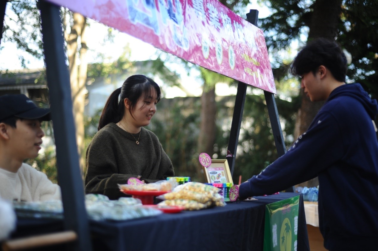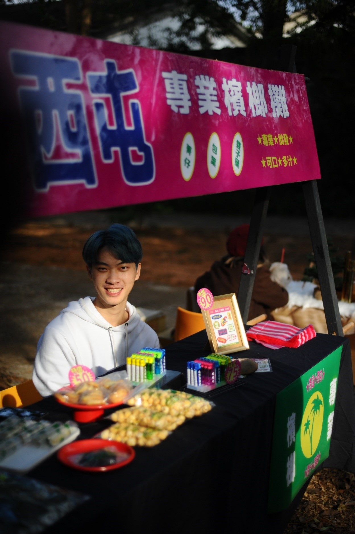 西屯專業檳榔攤(學生擺攤):賣大三同學設計的周邊商品以及手工製作的小點心,有貼紙、打火機、盲盒(吊飾)、衣服、手工餅乾、檳榔形狀巧克力。
