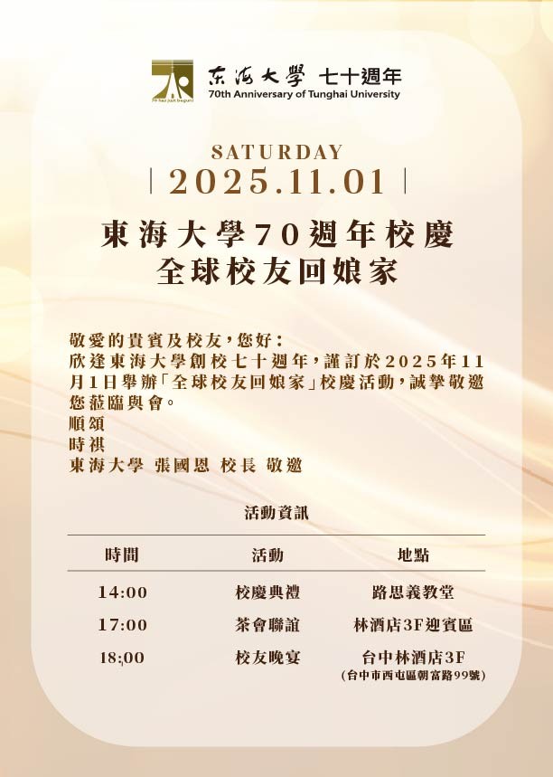 欣逢母校東海大學創校七十週年,特訂於 2025年11月1日(星期六)隆重舉辦「全球校友回娘家」校慶系列活動。誠摯邀請您認桌捐款支持本次活動,與來自世界各地的東海人歡聚一堂,與師長共敘情誼,一同見證母校七十年的榮耀與發展。