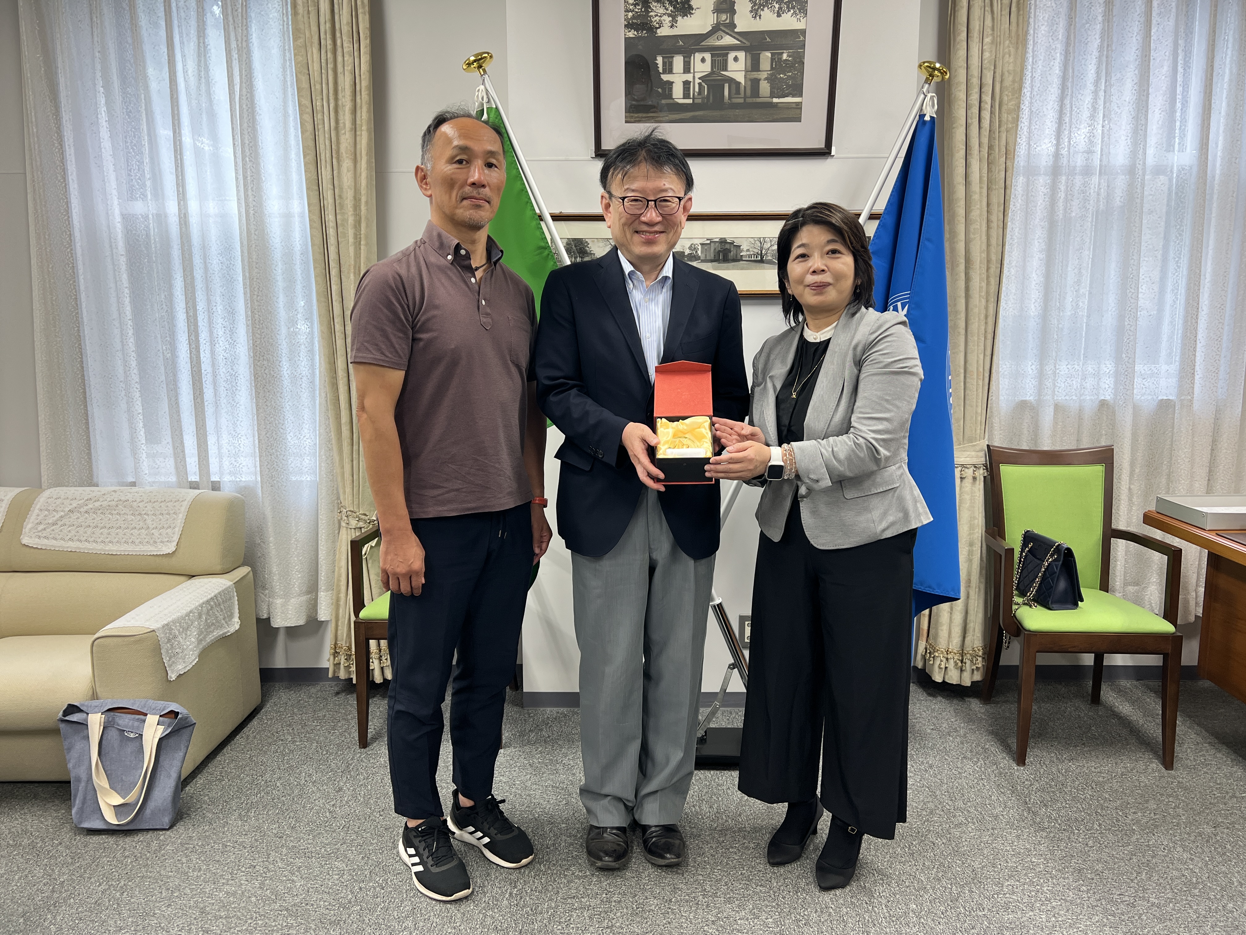 (圖左)與北海道大學野口農學部長(中)合照 (圖右) 與北星學園大學 中村校長(前左二)大合照