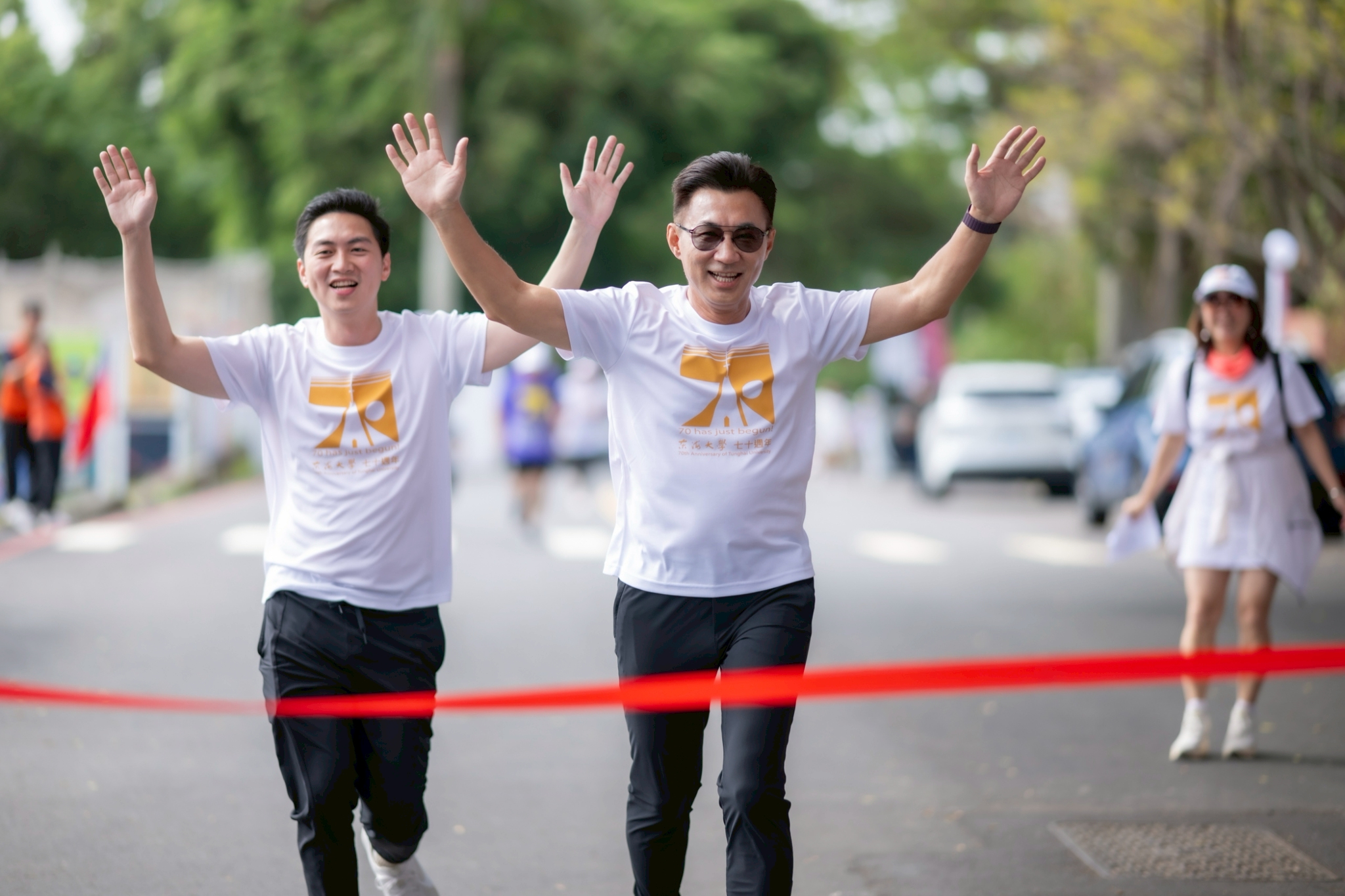 「東海七十健康路跑邁向永續」活動,立法院副院長江啟臣(右)、廖偉翔(左)開心通過終點線