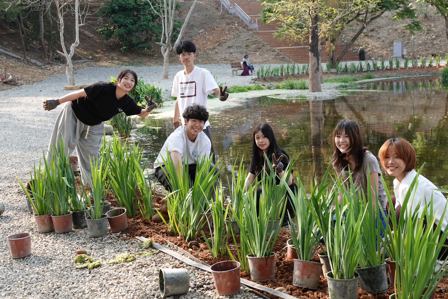 總務長柯耀宗也表示,東海湖過去因漏水乾涸已久,如今不僅恢復生機,在校友的添磚加瓦下,更增添色彩,期望未來師生及民眾都能感受這個美好的校園環境。植樹活動也特別邀請景觀系鄒君瑋教授進行植栽解說與指導、師生親自參與實作,種下野薑花、鳶尾、腎蕨、滴水觀音、天堂鳥、春不老、鵝掌藤、杜鵑、金橘與厚葉石斑木等十種多樣化的親水苗木,為校園留下世代共享的綠意。