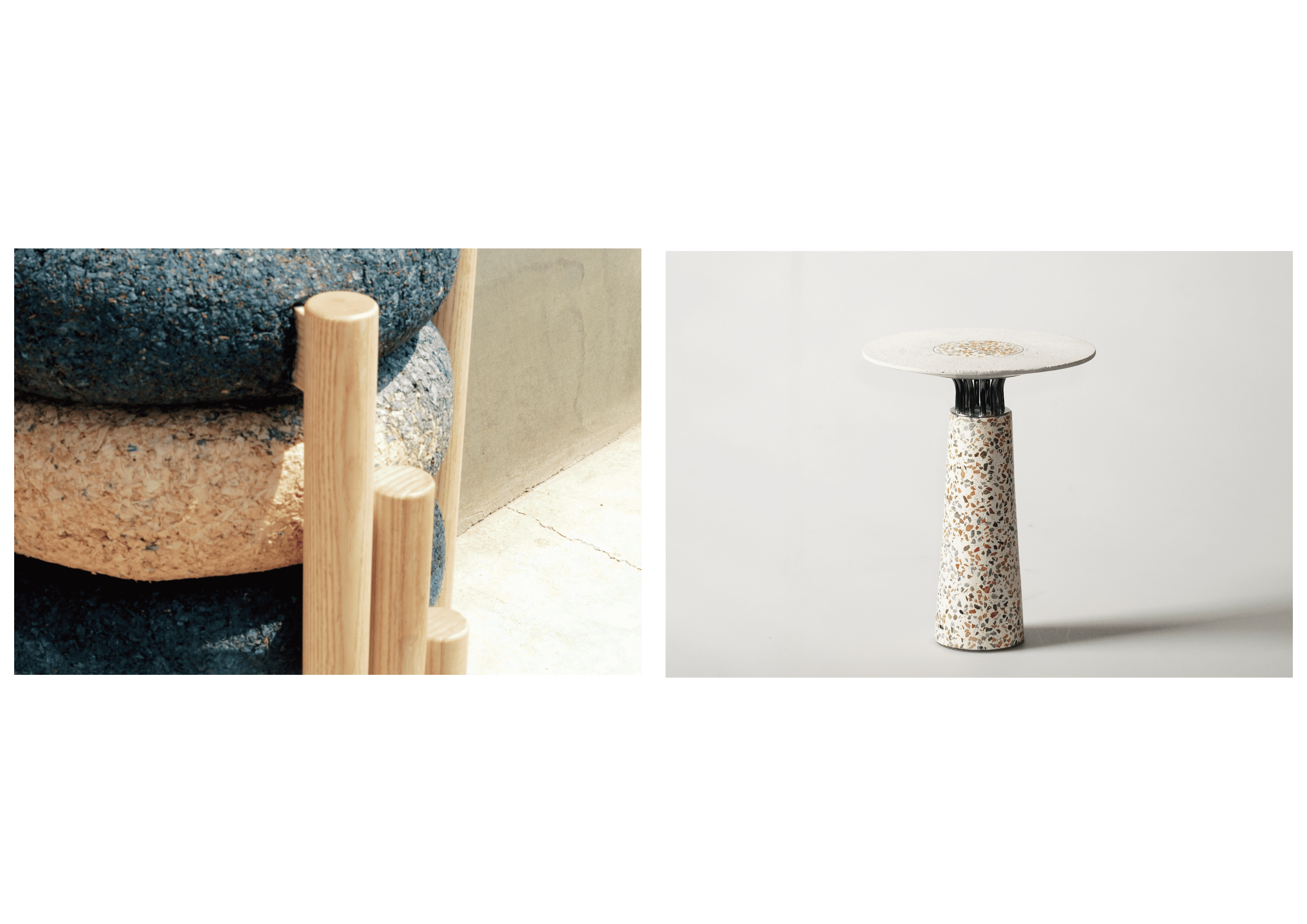 在工藝/家居/材質實驗類,由高鈺荃及張祐瑄兩位學生共同研究開發的〈Indigrove〉,此作品結合藍染工藝與工廠廢棄木屑,打造天然且獨具特色的椅凳與咖啡邊桌。這個作品將工藝概念融入日常生活,並賦予廢棄材質新的生命與價值,獲得金點新秀設計獎評審的肯定。而由戴辰霖與楊巧薇兩位學生共同設計的 〈Vestige〉作品,獲得國立台灣工藝研究發展中心工藝新趣計畫的獎助,將拆除與裝修後產生的廢棄土石重新做為可用建材,融入磨石子工藝,將廢棄建材蛻變為有質感的生活道具。