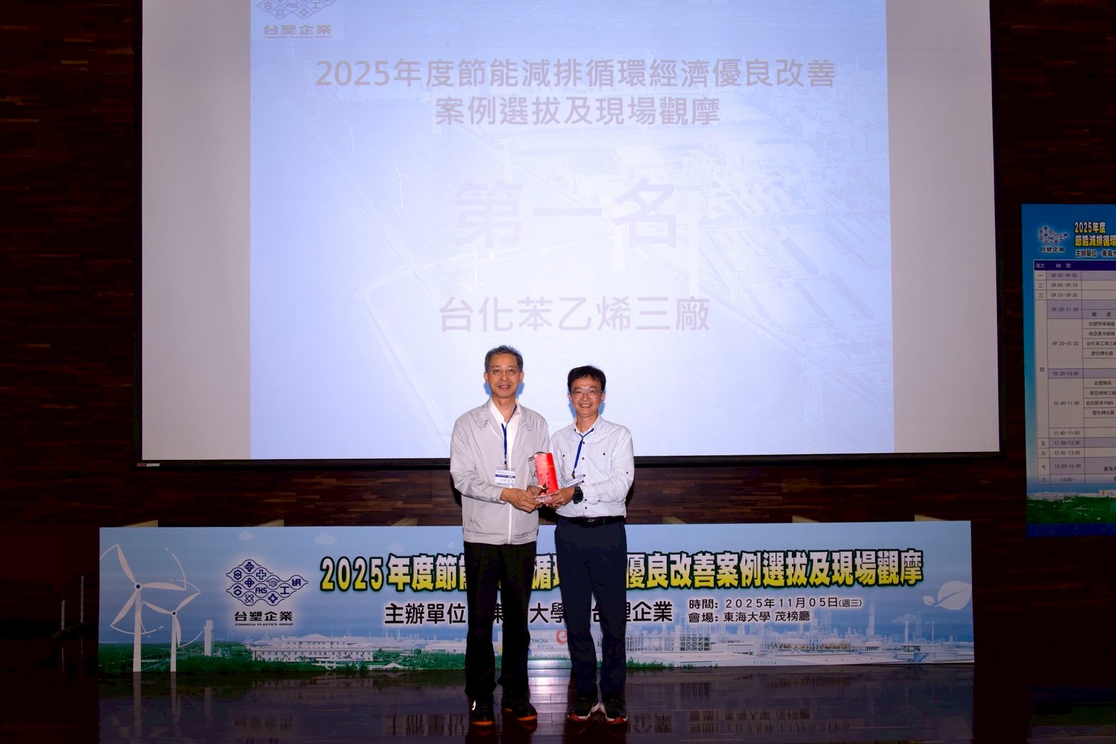 本次活動由東海大學工學院院長黃欽印與台塑企業塑化公司資深副總林智清共同主持,邀集產官學界專家共同評選台塑企業各公司提出的八項優良案例。經評選後,第一名為台化公司苯乙烯廠「乙苯塔多效蒸餾節能改善」案例;第二名為塑化公司煉油部轉化廠「轉化廠煤油加氫脫硫單元加熱爐煙道氣廢熱回收節能改善」案例;第三名為台塑公司丙烯腈廠「廢氣焚化爐燃料轉全燃氣改善」案例。