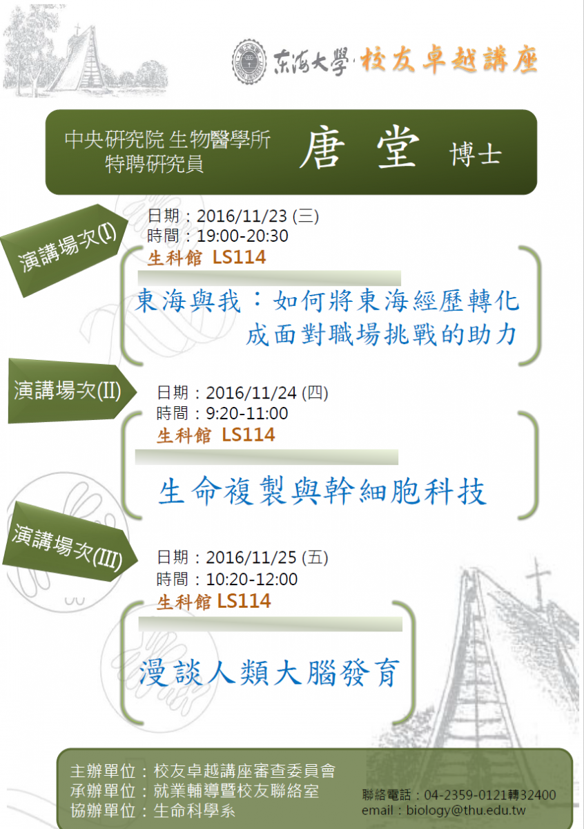 唐老師第一場演講在11月23號晚間與大學部同學交流大學生活點滴,分享他在校時最主要的心得:1學風自由的學習環境2好奇心驅使研究興趣3主動積極心態4多方涉獵與跨領域探索等。第二場演講在11月24號與大學部同學及研究生分享他研究專長領域之ㄧ的「生命複製與幹細胞科技」從「生命自何時開始」說起。第三場演講在11月25號與大學部同學及研究生分享他另依個專長領域「漫談人類大腦發育」從人類到動物的大腦發育談起。參與同學反映系列專業演講對他們有極大的幫助。 |