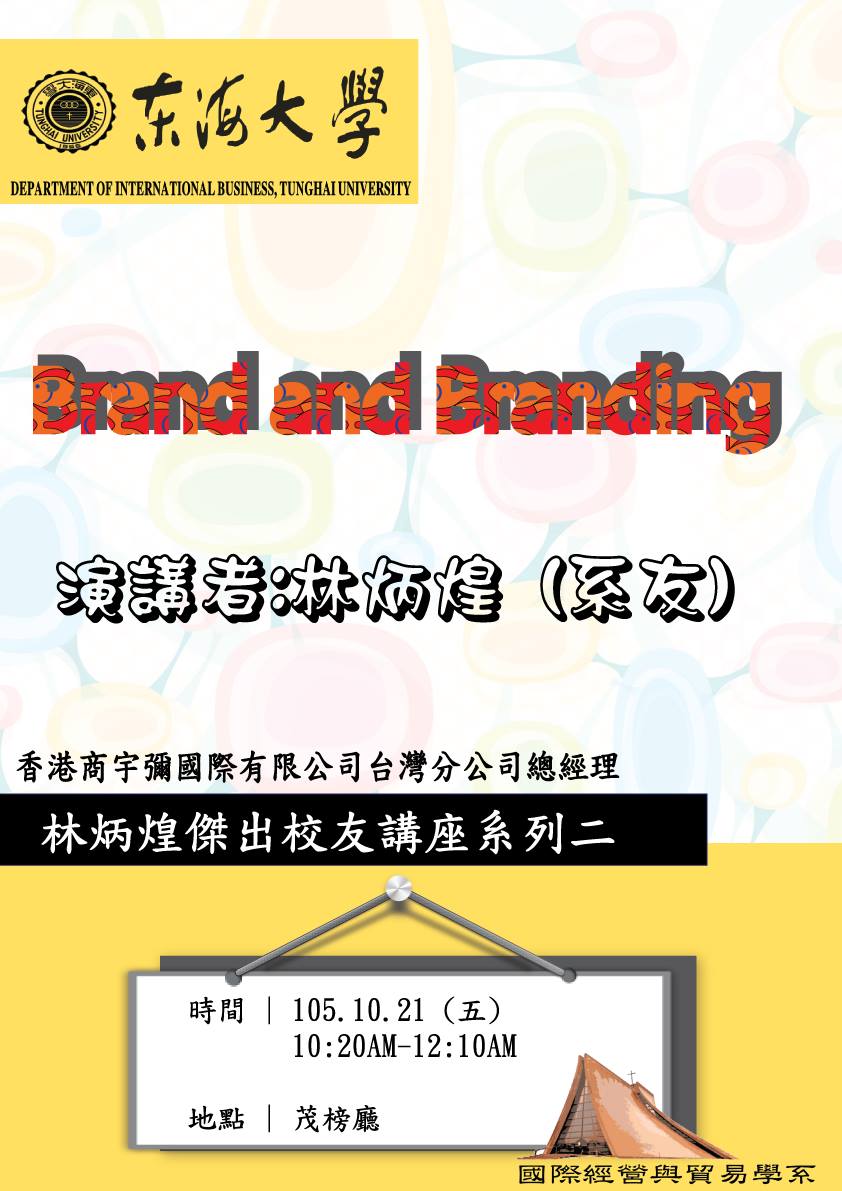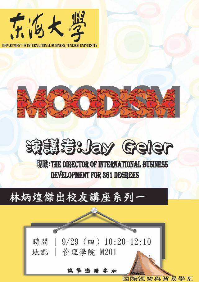 此三場演講,其實是具有關聯性。 第一場演講Moodism,林炳煌系友請了公司裡的資深幹部Jay Geier先生到場演講。Mr. Geier以自身如何處理每日情緒,不管是好或壞,他都能以不同角度去改變自己的想法,講者告訴我們不論是商人或是一般大眾,皆須要有高EQ,這樣才能讓自己每天都快樂與幸福。 第二場演講Brand and Branding,是在說明如何讓自己,不僅是品牌,成為一個具有品牌的概念。演講中提到,希望學生能自我進取,學習不同領域知識,未來職場上才能成為卓越之人,是自己選擇企業,被企業挖角,而不是每日擔心是否會被社會淘汰,讓自己成為個人品牌是件重要的趨勢。 第三場演講Are we still loving? Are we still having dreams?校友請來香港商宇彌公司在其他各地分公司之三位總經理來分享他們的夢想是如何達成自己的夢想,如何離成功又更進一步,並且提醒學生們,在追求夢想的路程上可能會歷經許多挫折,不過要堅持下去,成功是留給堅持的人! |